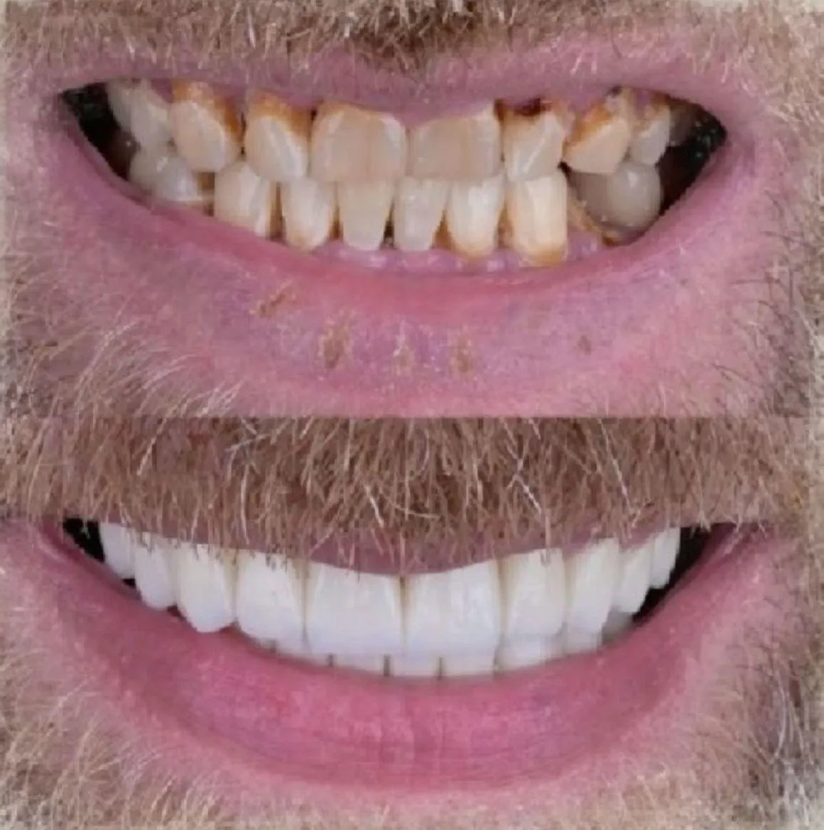 Usunde tænder er ofte knækkede og har plak, misfarvninger og tandsten på dem.